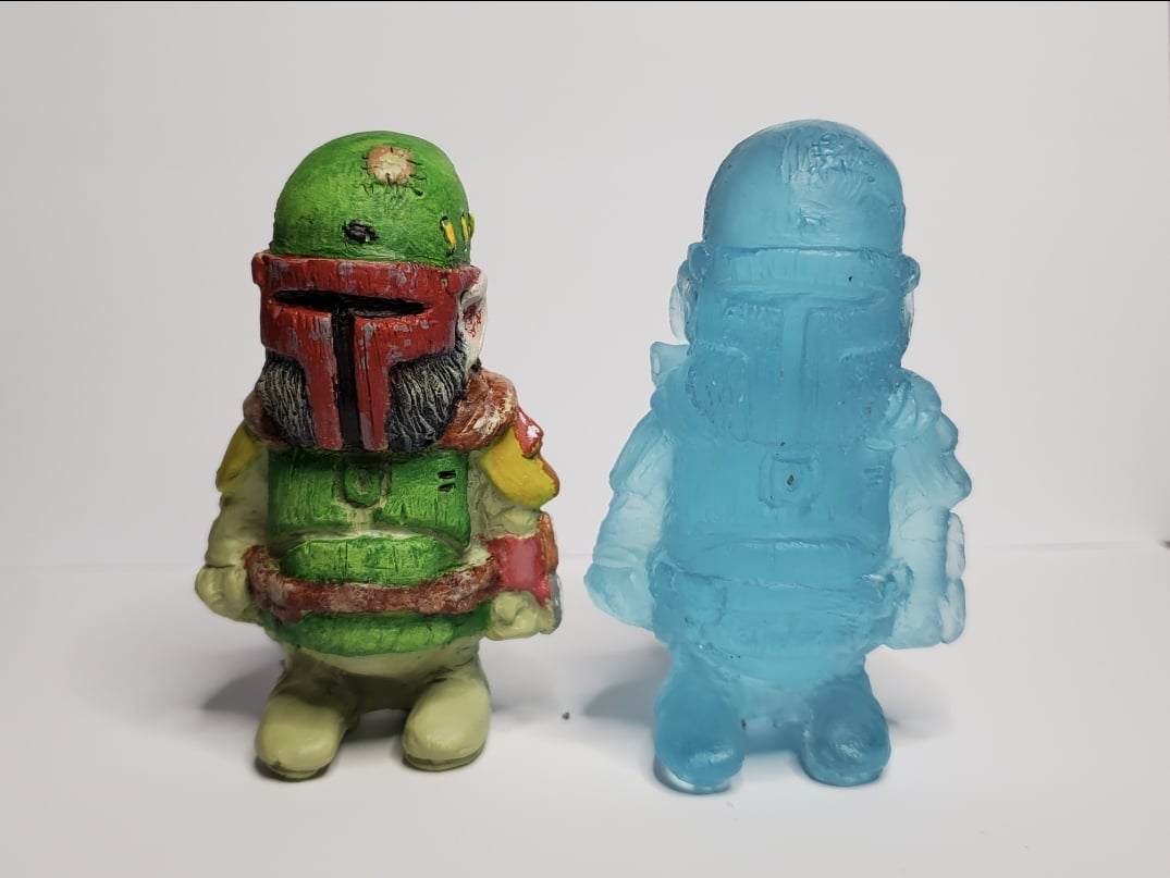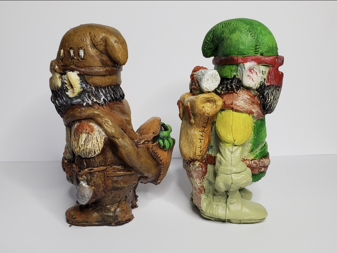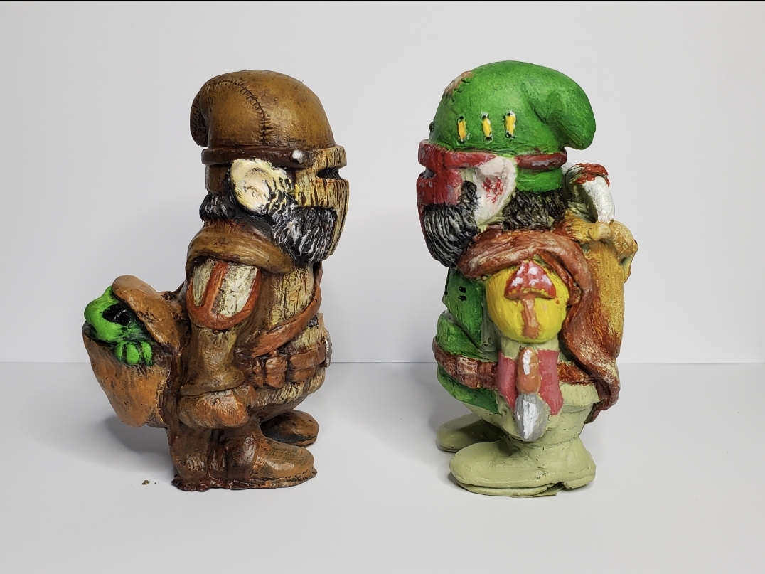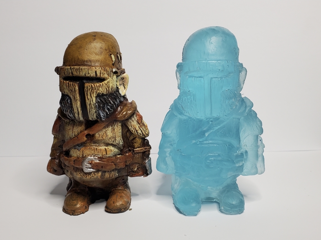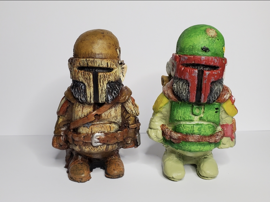 The Gnomes of MandaGnome are a series of figures the first two are The MandaGnomeian with his lil frog buddy and Gnoma Fett each one comes in a fully painted version or a hologram version